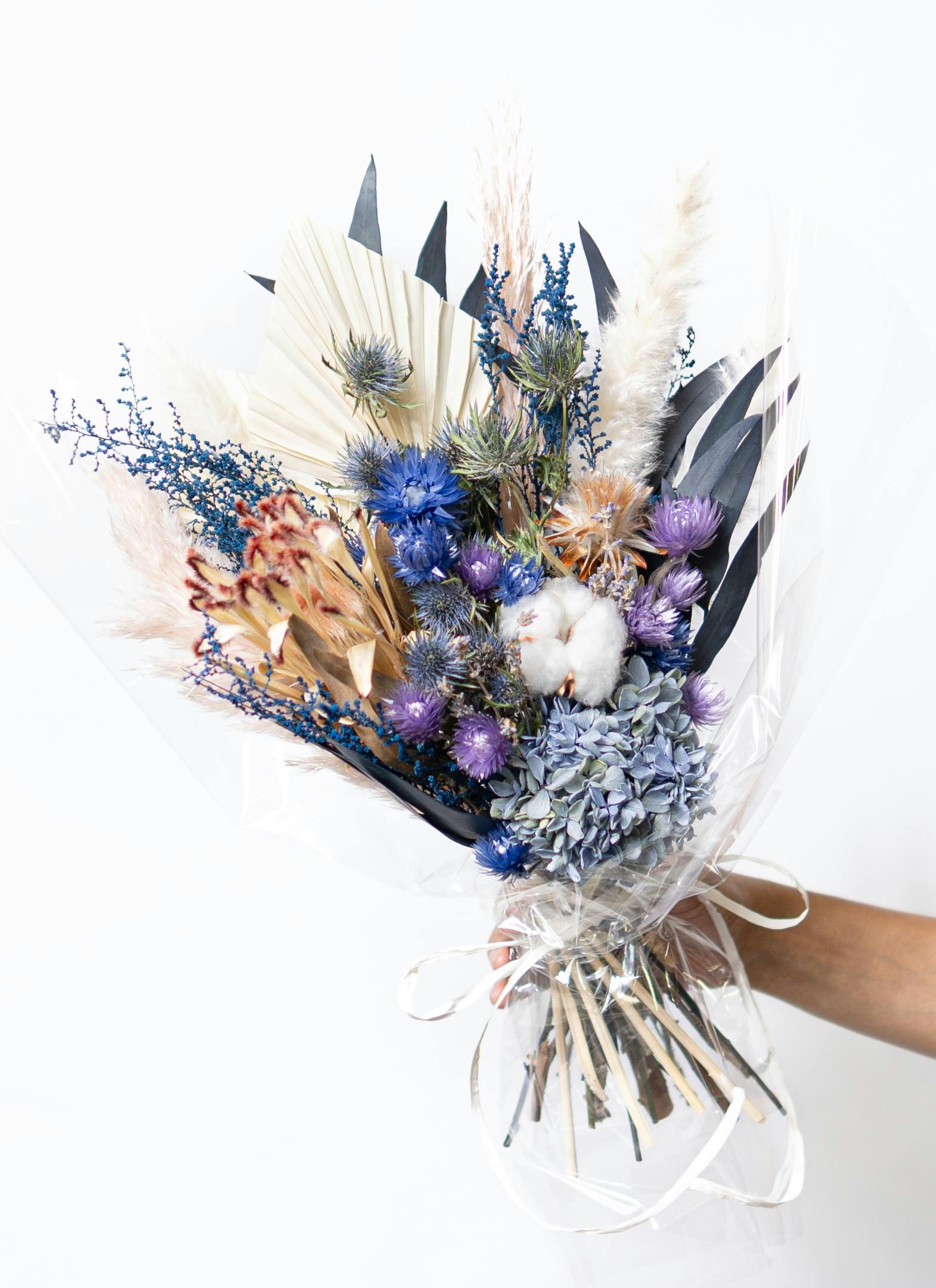 ブルーパープル系のドライフラワーを中心に構成した、HitoHanaオリジナルのお花です。スワッグとしても、ブーケとしても楽しめるようにお手持ち部分の長さを調整しています。お部屋の雰囲気や気分に合わせて楽しむことができます。