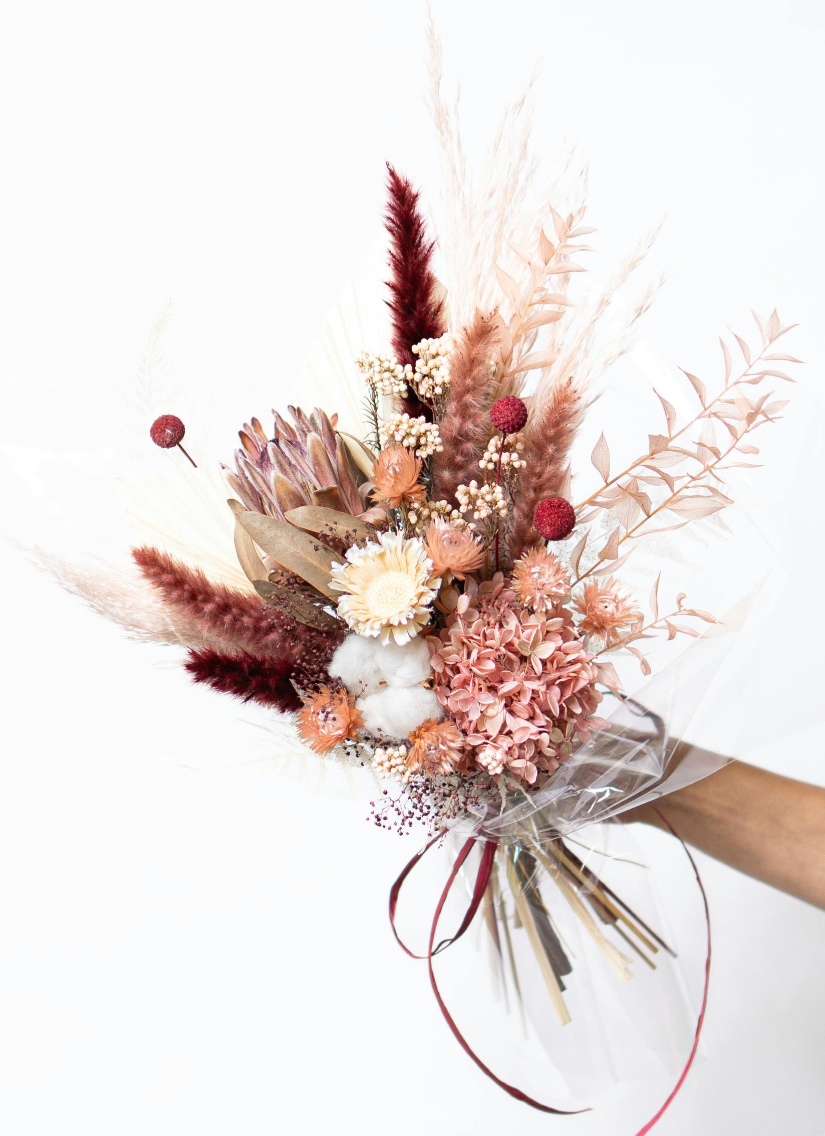 ピンクレッド系のドライフラワーを中心に構成した、HitoHanaオリジナルのお花です。スワッグとしても、ブーケとしても楽しめるようにお手持ち部分の長さを調整しています。お部屋の雰囲気や気分に合わせて楽しむことができます。