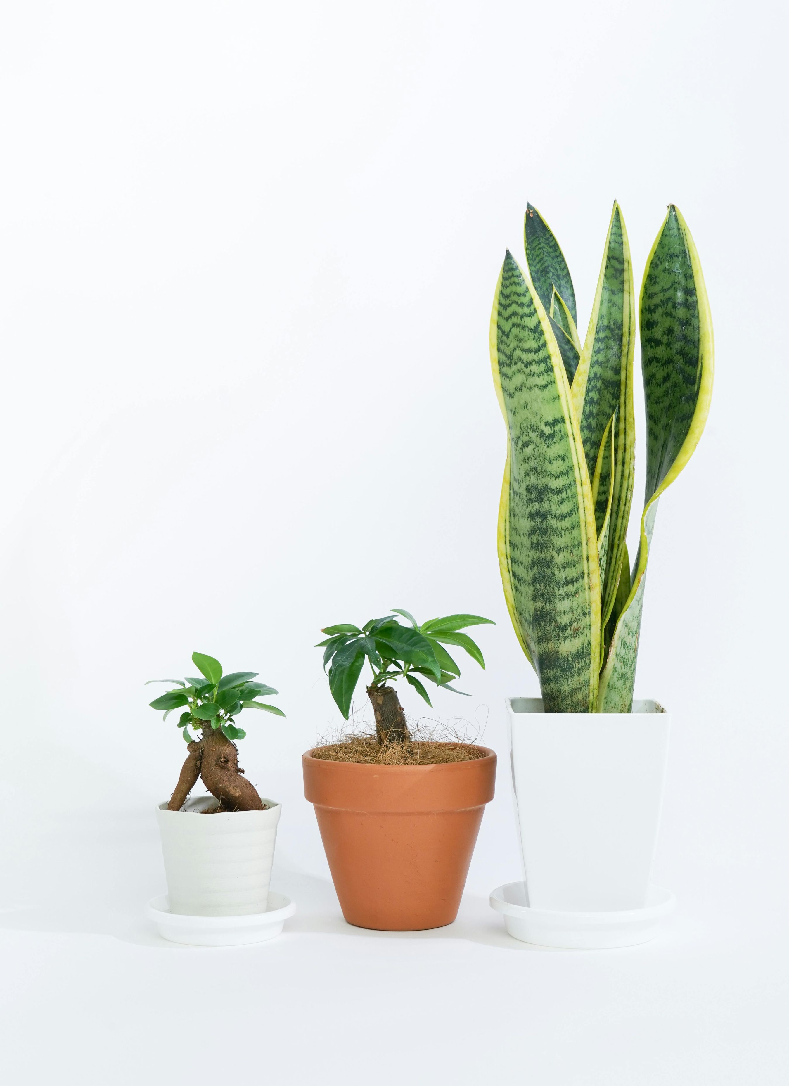 小型の植物3点のおためしセットです。初めて観葉植物を育てる方にも安心してお世話いただける、育てやすい植物を揃えました。定番のサンスベリア、樹形のかわいいガジュマル、テラコッタの鉢に入ったパキラの3点をまとめてお届けします。