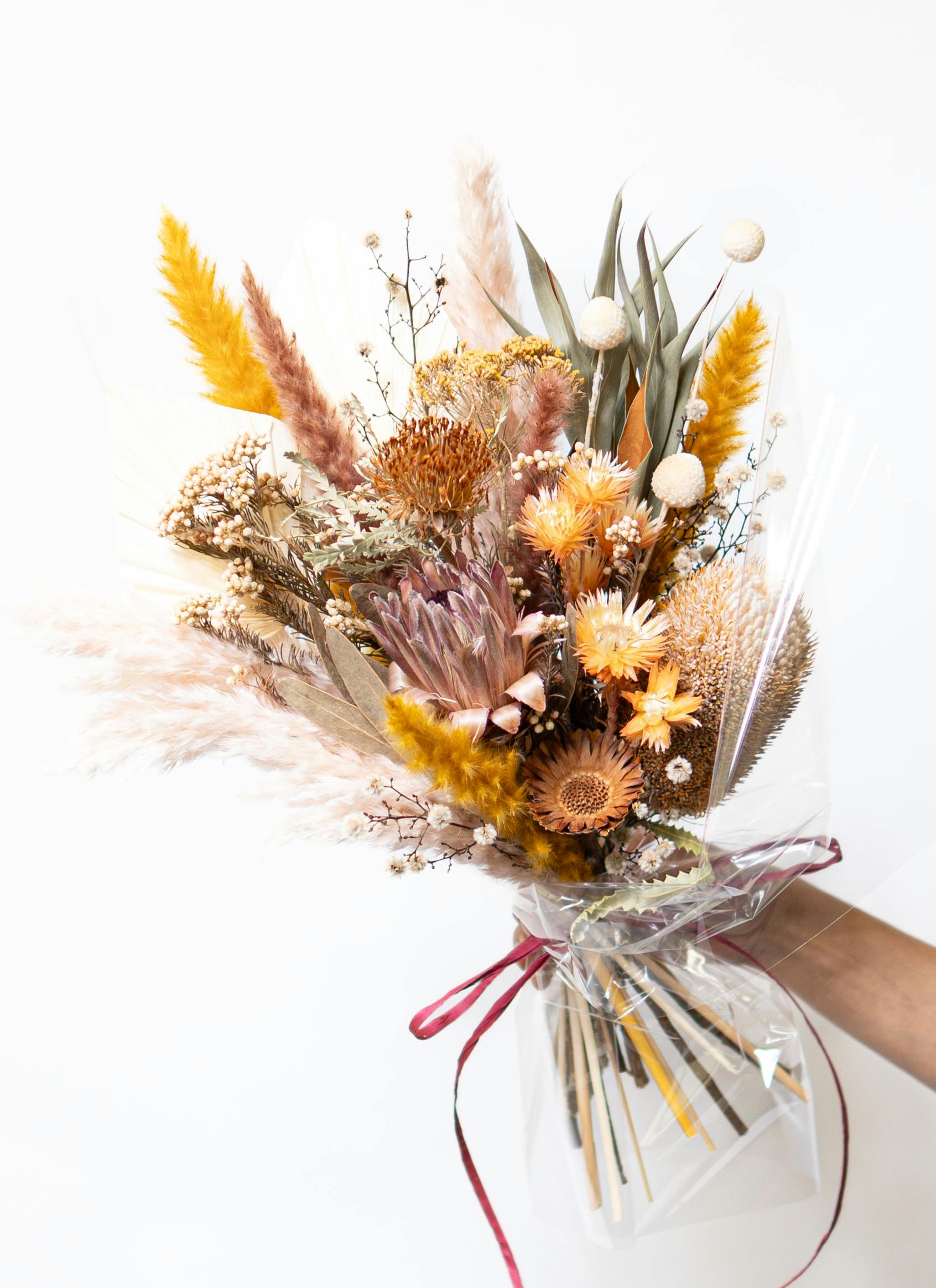 イエローオレンジ系のドライフラワーを中心に構成した、HitoHanaオリジナルのお花です。スワッグとしても、ブーケとしても楽しめるようにお手持ち部分の長さを調整しています。お部屋の雰囲気や気分に合わせて楽しむことができます。