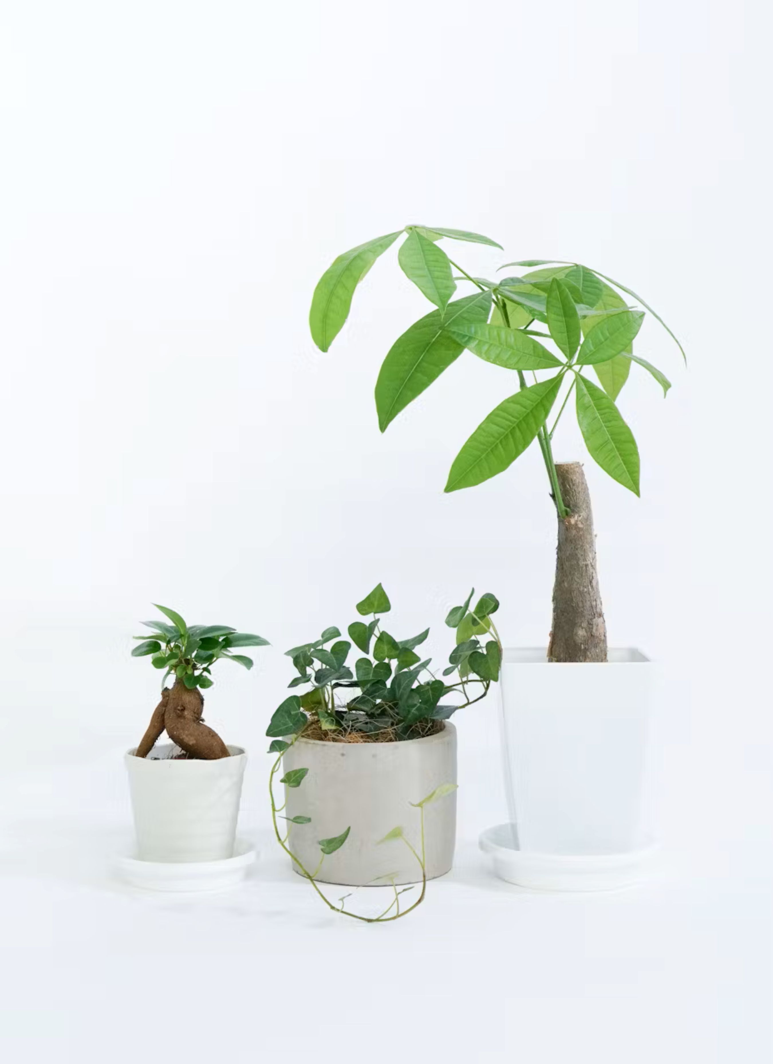 小型の植物3点のおためしセットです。初めて観葉植物を育てる方にも安心してお世話いただける、育てやすい植物を揃えました。定番のパキラ、樹形のかわいいガジュマル、シックな鉢に入ったアイビー(ヘデラ)の3点をまとめてお届けします。